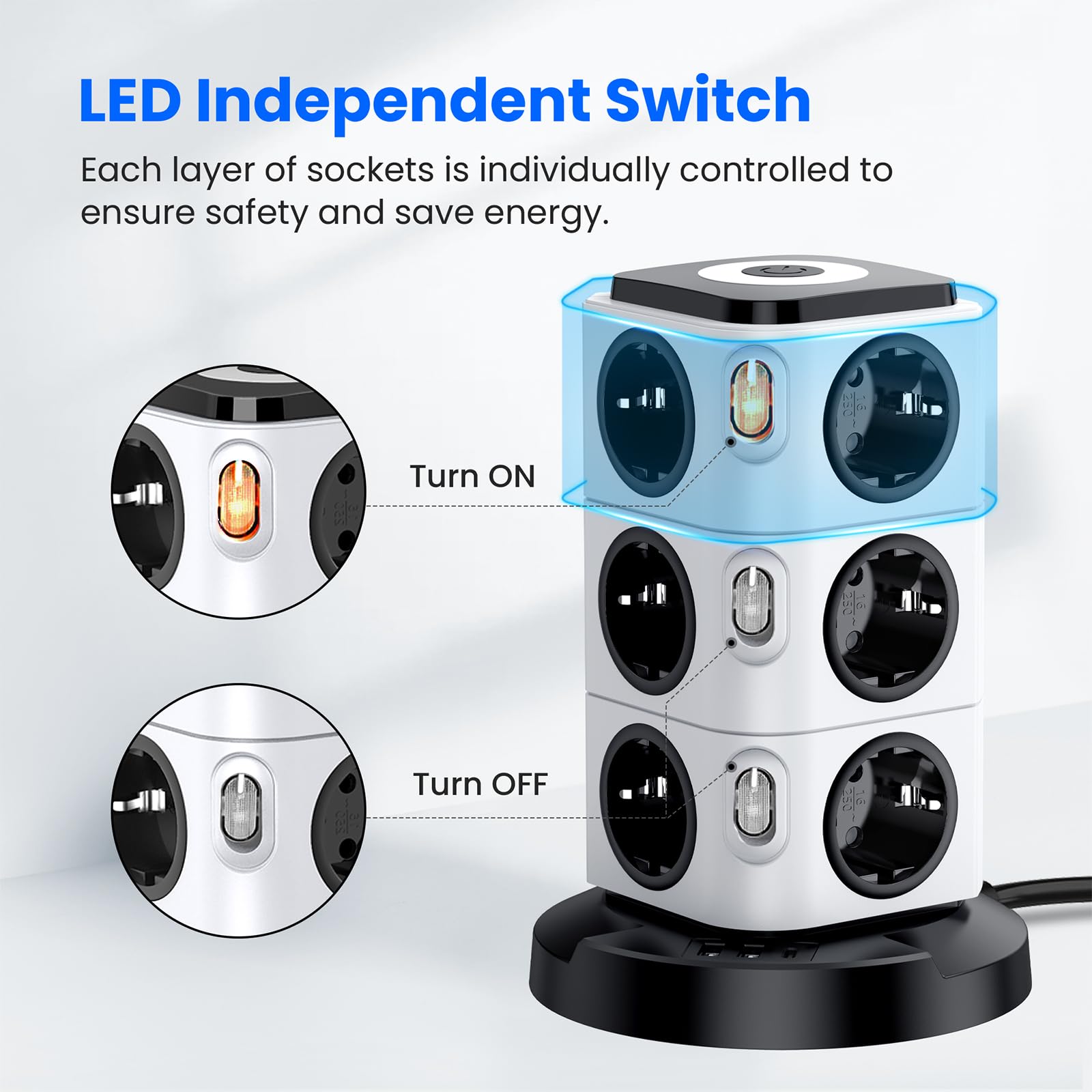 - 【Construction peu encombrante】Design vertical Le design vertical innovant des prises de la tour de prises révolutionne les multiprises traditionnelles, prend moins de place sur le bureau et offre en même temps plus de prises de courant. Cette disposition facilite la gestion des câbles et contribue à un poste de travail ordonné et organisé. Grâce à son encombrement compact, elle est idéale pour les bureaux, les bureaux à domicile ou tout autre espace où l'efficacité et l'ordre sont importants.
