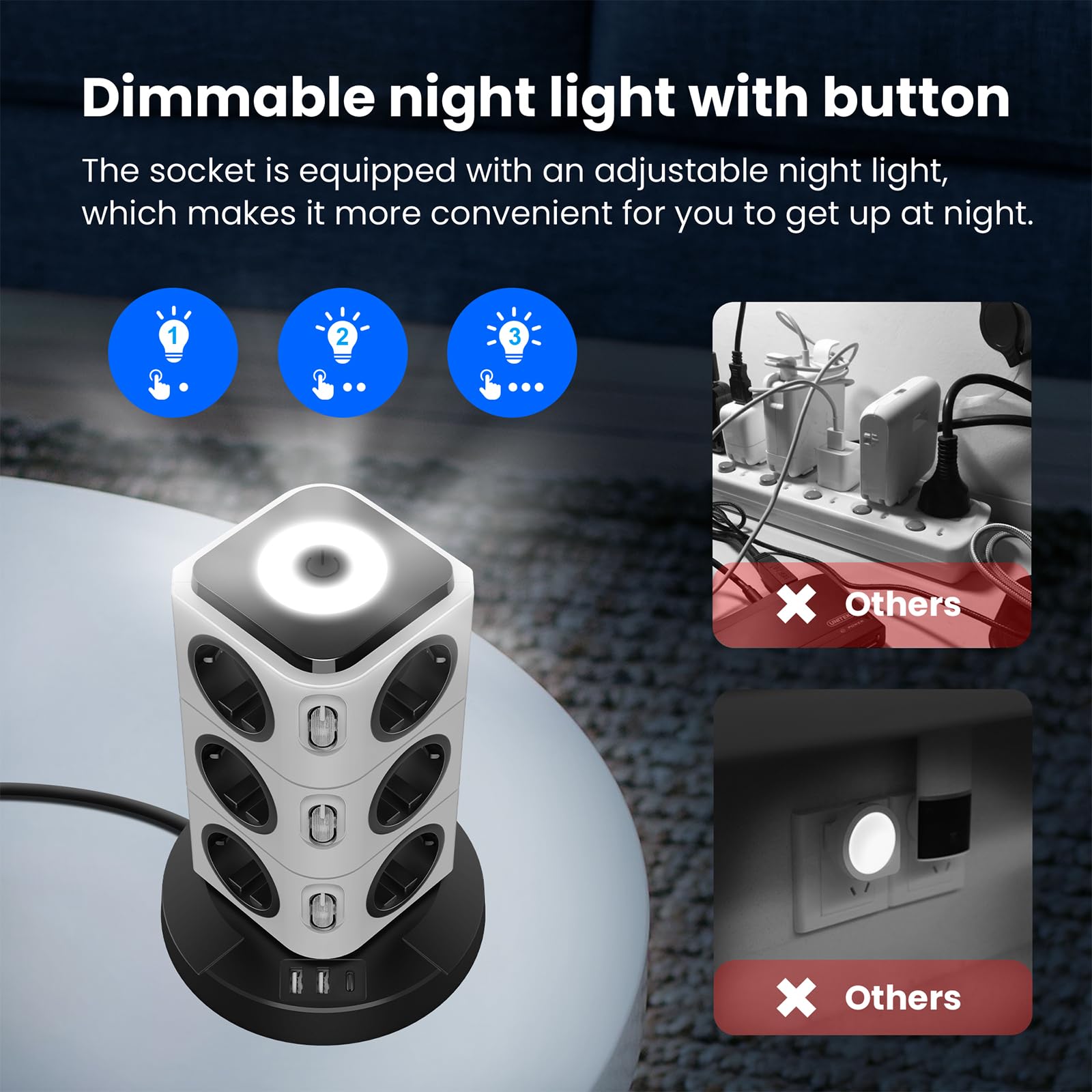 - 【Veilleuses LED】Conception intelligente de la veilleuse En plus de ses fonctions d'alimentation, le câble d'extension Tower dispose d'une veilleuse intégrée avec trois niveaux de luminosité réglables et un interrupteur sensible au toucher. Cela garantit non seulement une distribution efficace du courant, mais améliore également l'expérience de l'utilisateur grâce à un éclairage confortable et agréable pour les yeux. Convient pour les chambres à coucher, les bureaux ou les pièces nécessitant une combinaison d'électricité et d'éclairage ambiant.