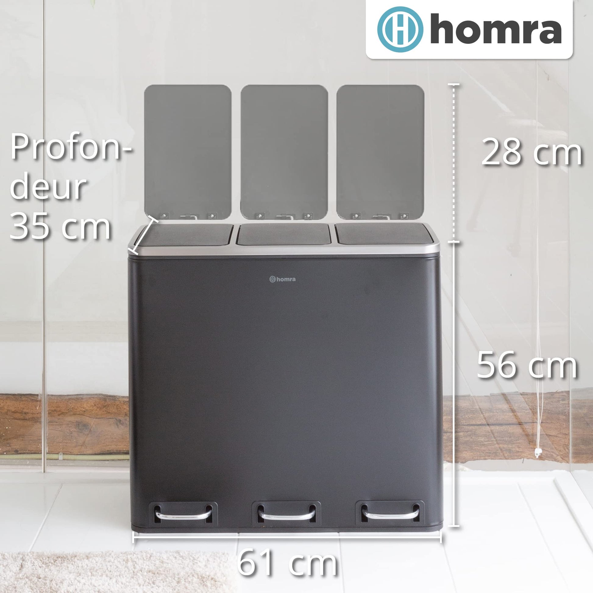 Homra Sparq Poubelle Tri Selectif 3 Bac | Poubelle Cuisine 54 Litres Acier inoxydable | Poubelle à Pédale 3x18 litres | Déchets et recyclage | 3 Bacs Amovibles et Fermeture Douce | Inox Noir