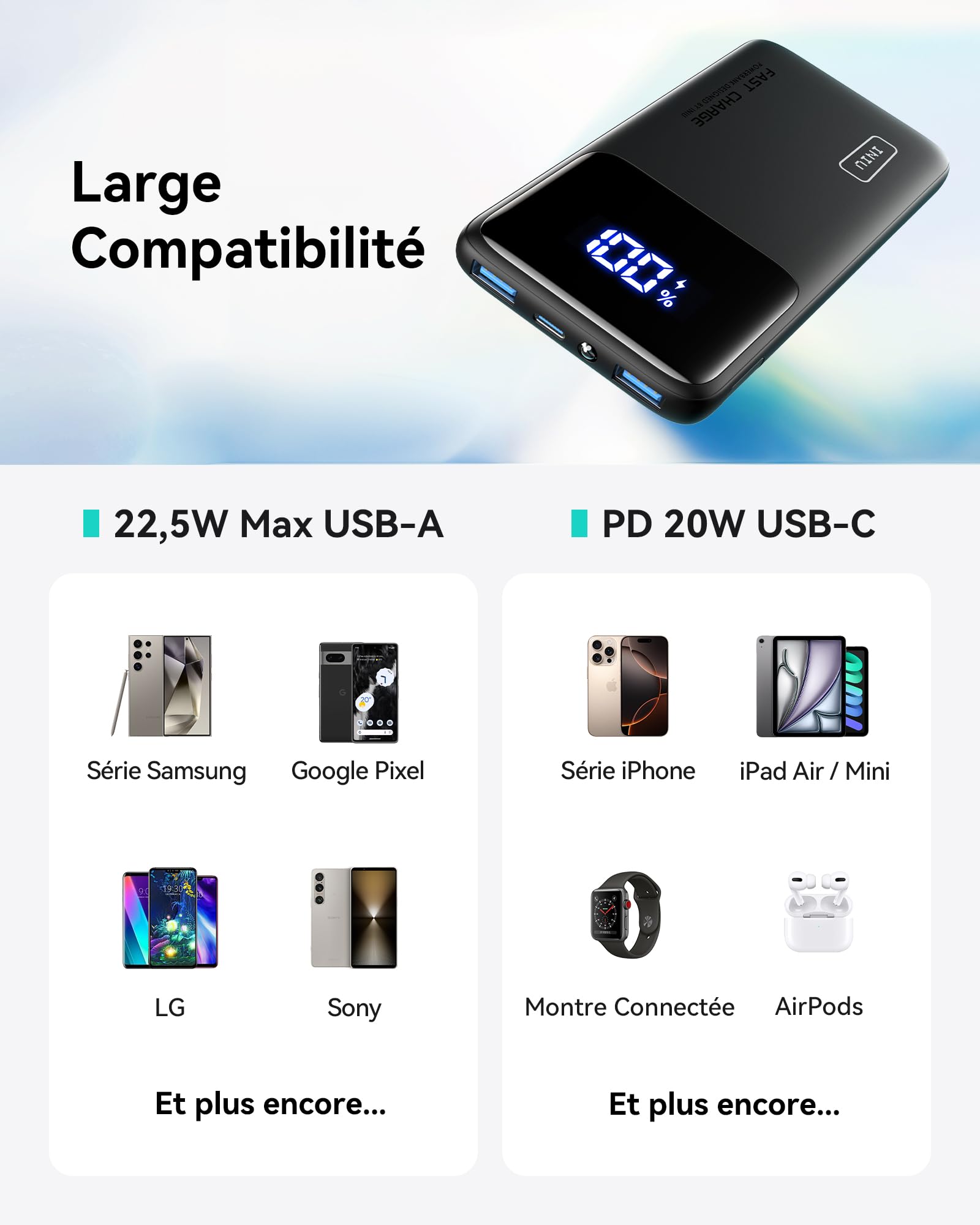 INIU Batterie Externe, 22.5W 10000mAh Power Bank, Batterie Portable USB C Input & Output PD3.0 QC4.0 Charge Rapide Powerbank Compatible avec iPhone 16 15 14 13 12 Pro Max Plus Samsung iPad Pro etc