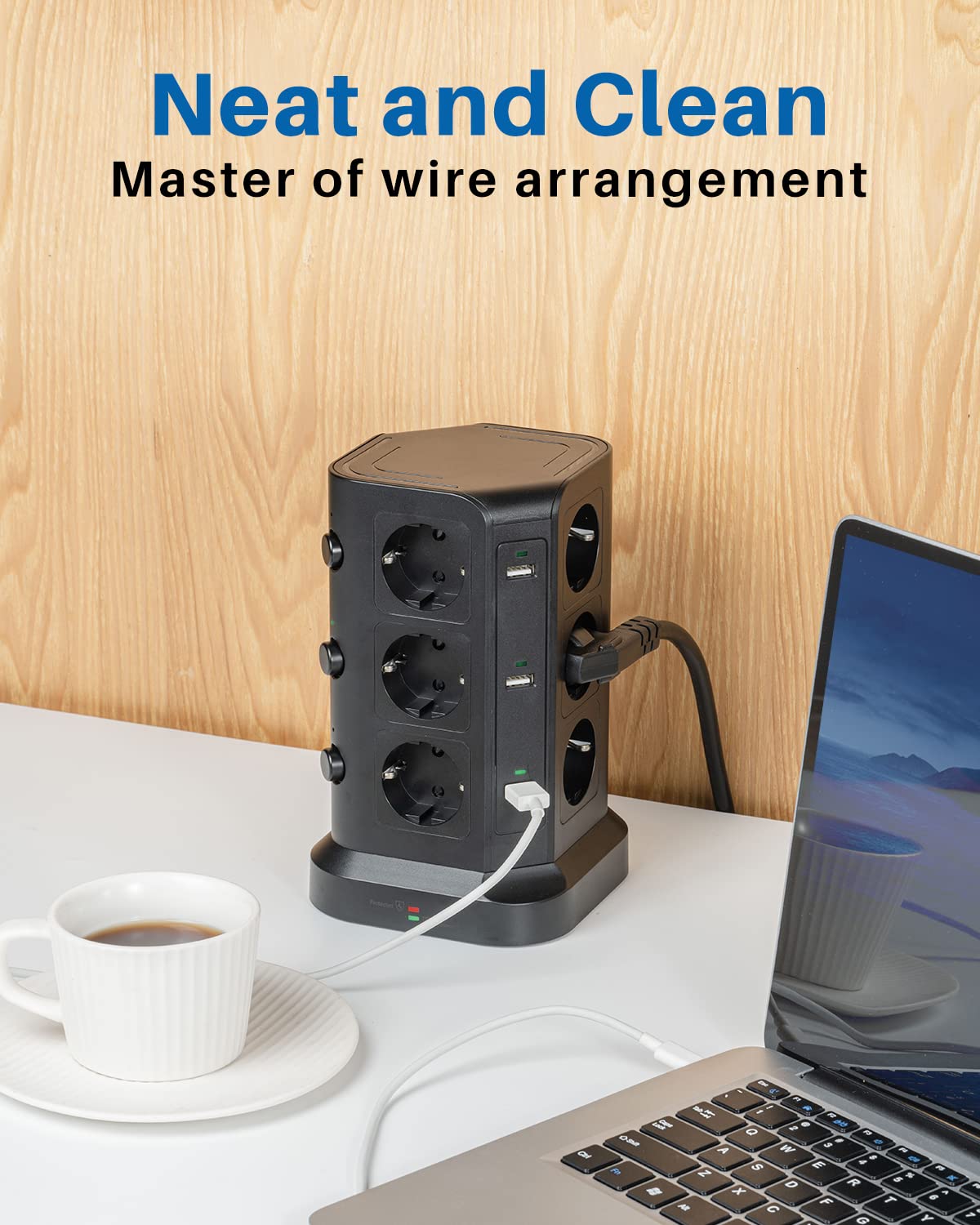 - VÉRITABLE GAIN DE PLACE : La multiprise est équipée de 12 prises CA et de 6 ports USB avec des prises perpendiculaires au sol, ce qui permet d'optimiser l'espace par rapport aux multiprises traditionnelles. Espacement et orientation ergonomiques des prises pour une meilleure organisation de l'espace.