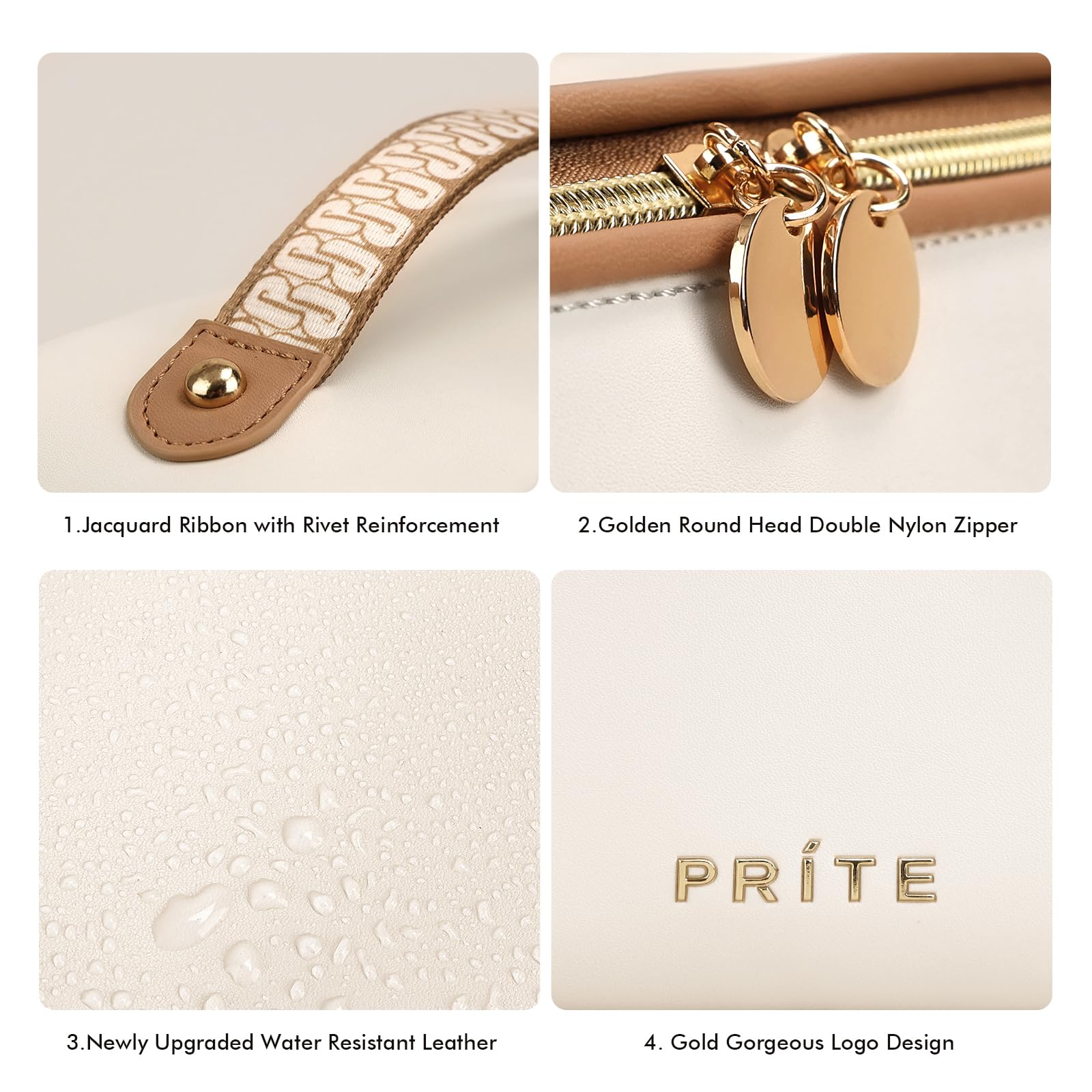 Prite Grande Capacité Trousse de Maquillage pour Femme Trousse de Toilette en Cuir PU Vanity Imperméable pour Voyage avec Séparateur Transparent et Poignée (Beige)