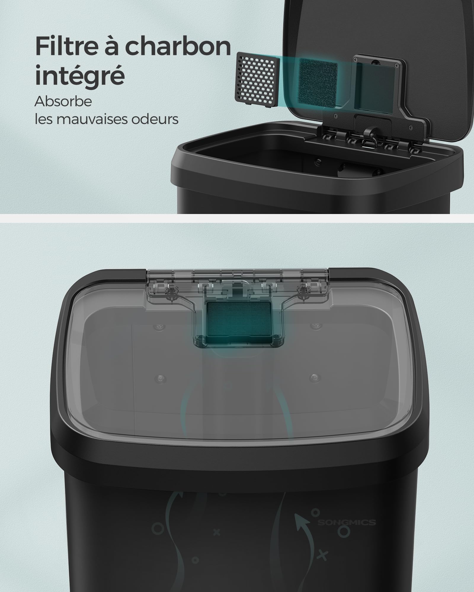 - [Détails bien pensés] Le filtre à charbon dans le couvercle aide à absorber les mauvaises odeurs et garde votre cuisine fraîche. 15 sacs poubelle (45-55L) parfaitement adaptés sont inclus