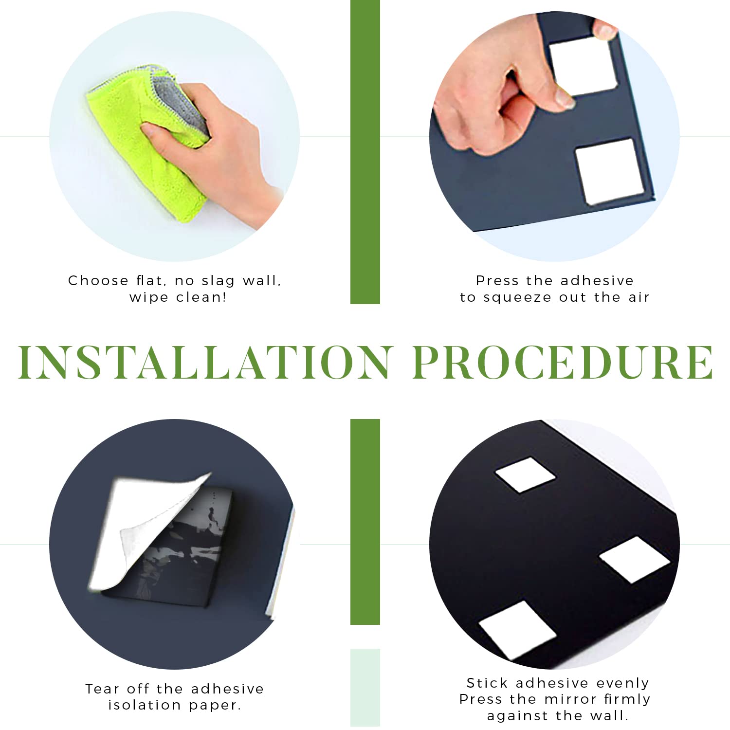 - INSTALLATION FACILE: vous recevrez 4 pièces de carreaux de miroir, qui peuvent être installées rapidement et facilement grâce au ruban adhésif double face. L'adhérence des bandes est durable. Remarque : ces autocollants miroir ne peuvent être utilisés que sur des murs plats et lisses ou des meubles