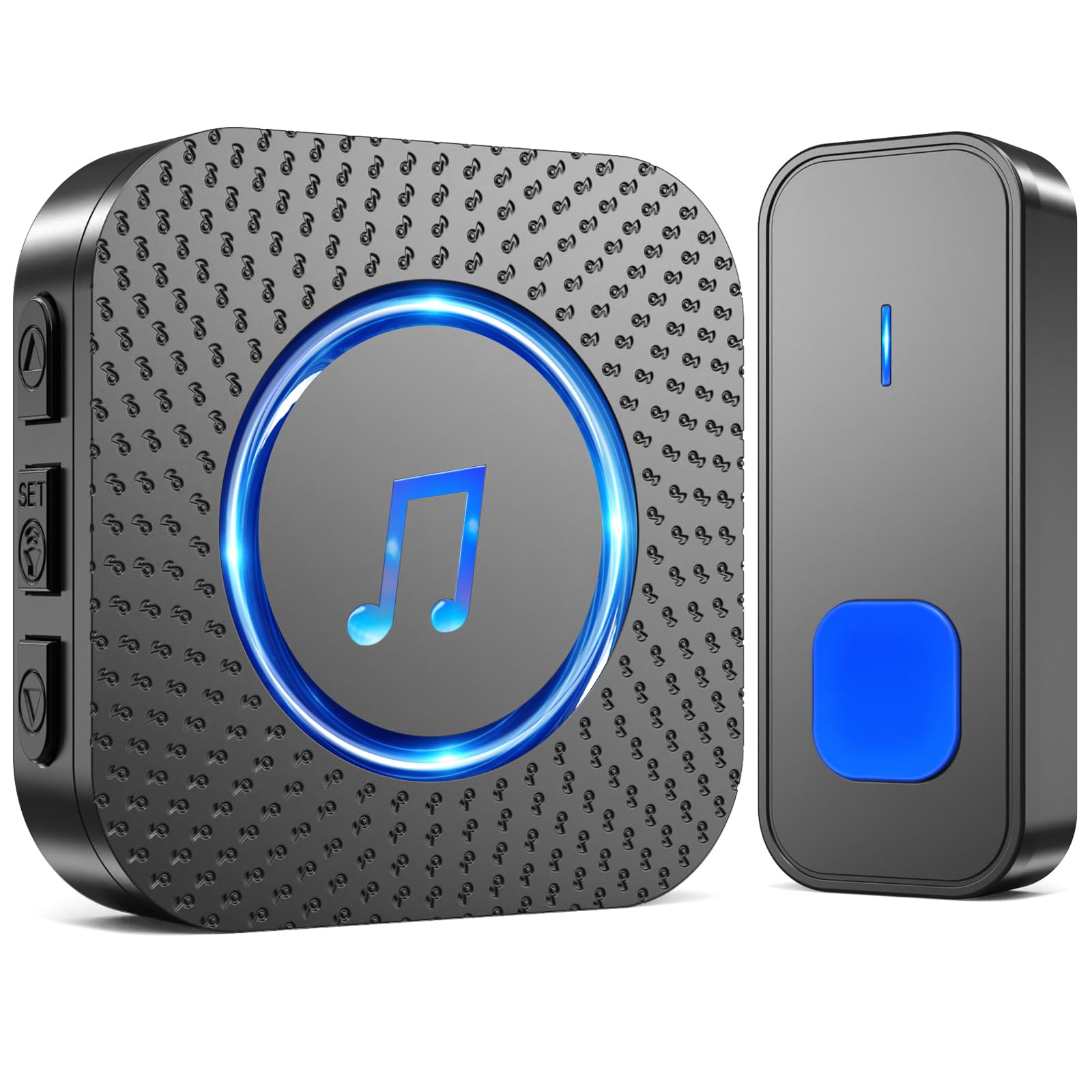 SURFOU Sonnette sans Fil, 400M Sonnette Longue Portée Exterieur Étanche Electronique, Kit de Carillon avec Récepteurs Enfichables pour la Maison, LED Bleu, 55 Mélodies, 5 Niveaux Volumes, Noir