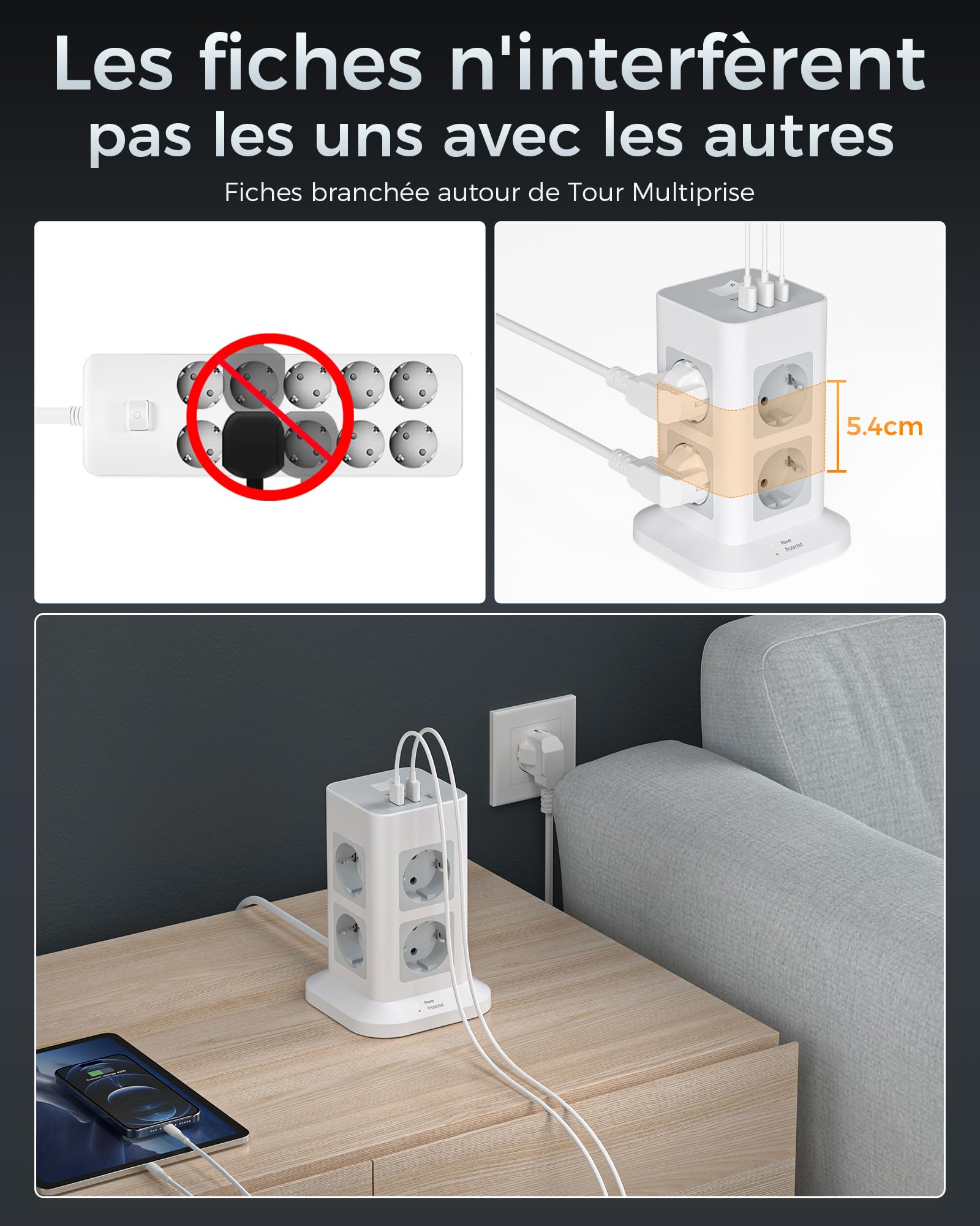 - 11 en 1 Tour Multiprise avec USB: Equipé de multiprise 8 prises, 2 USB et1 USB C, les 8 slots sont répartis sur les quatre côtés de la multiprise. Cette multiprise electrique parafoudre offre assez d'espace pour chaque slot, ce qui est convenable aux grosses fiches. Tour multiprise avec usb c peut répondre aux besoins de charge de votre dortoirs universitaires, bureau à domicile