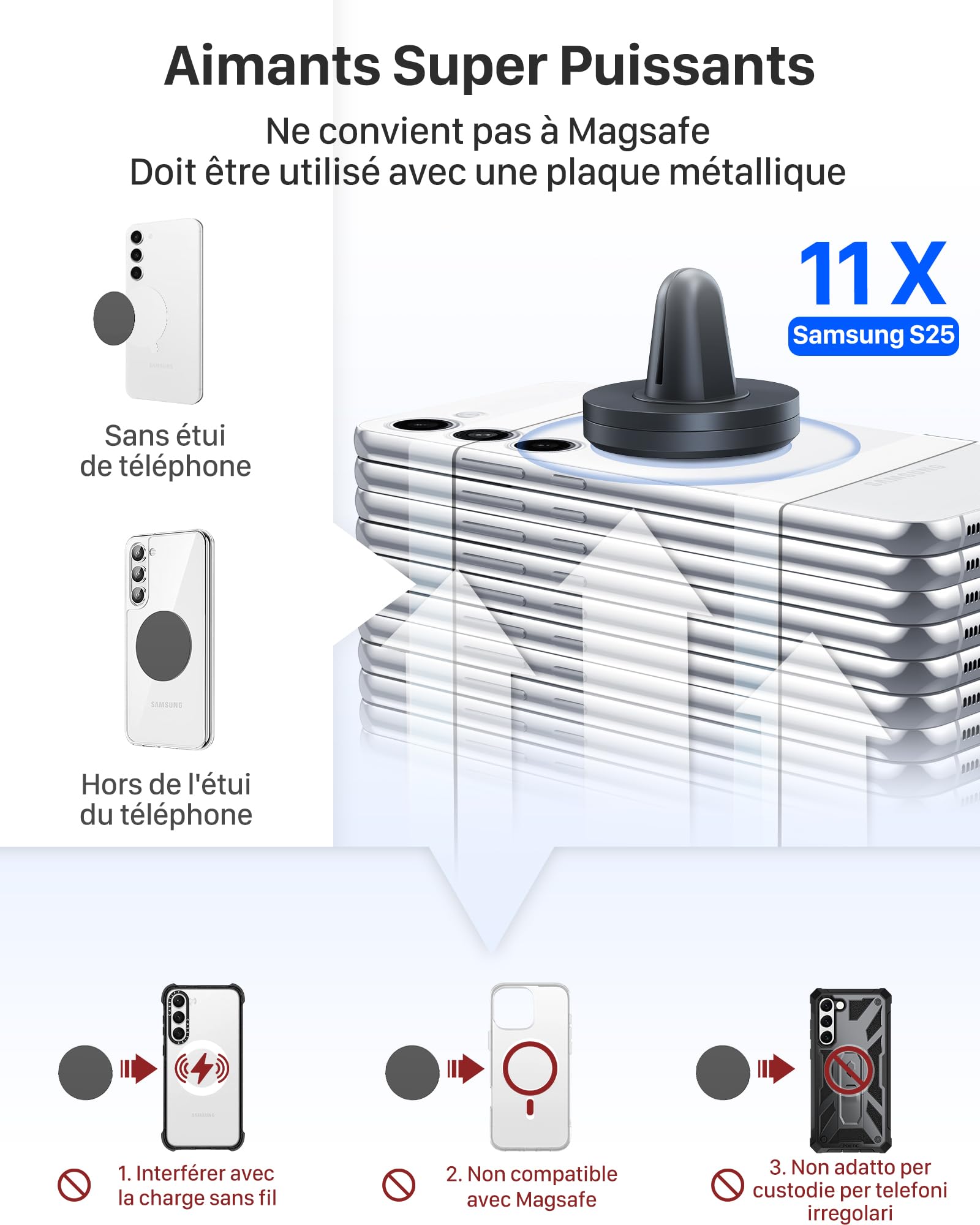 - Pas pour MagSafe : Veuillez coller la plaque métallique au dos de votre téléphone ou de votre coque, y compris les iPhone 16, 15, 14, 13 et 12. Notez que la plaque métallique n'est pas adaptée aux coques en silicone liquide, aux étuis et au verre. Assurez-vous d'une bonne adhérence pour une utilisation efficace