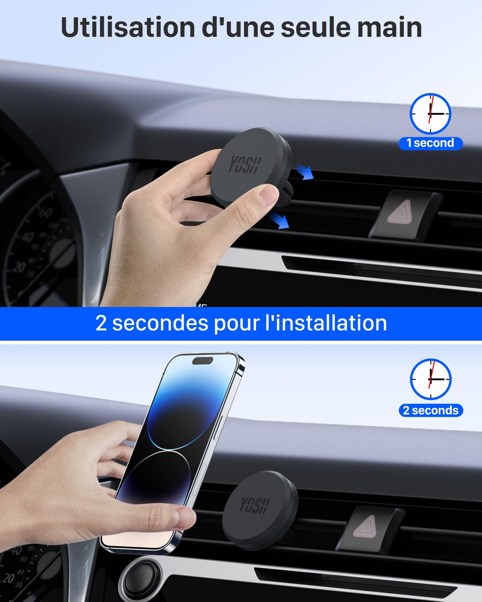 - Opération à une main et design raffiné : Avec le support de téléphone YOSH, vous pouvez facilement fixer ou retirer votre téléphone d'une seule main et ajuster commodément l'angle de votre appareil. La petite taille, avec un diamètre de 40 mm, rend le support magnétique YOSH à peine visible lorsqu'il n'est pas utilisé et ne bloque pas votre vue pendant la conduite