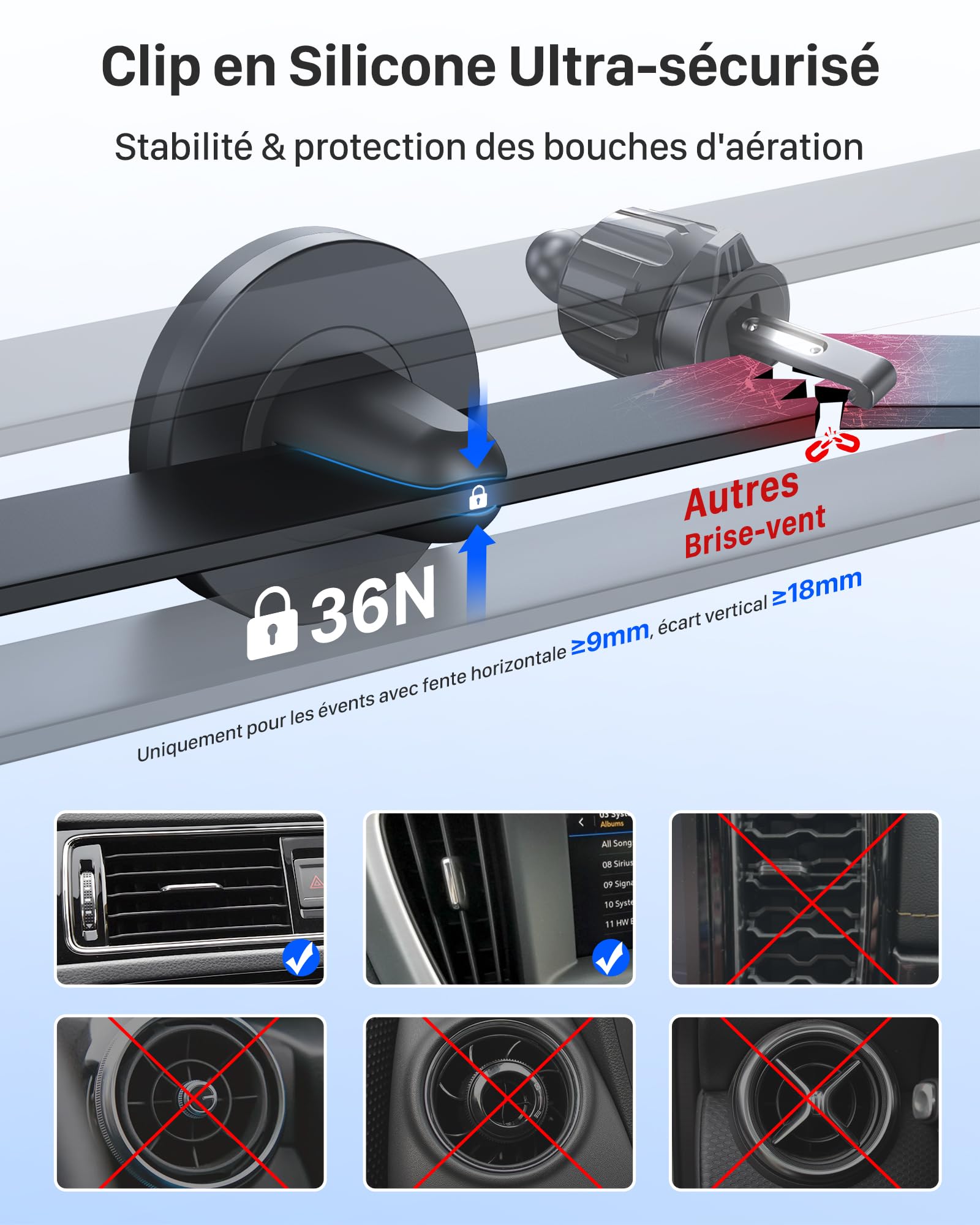 - Magnétisme puissant et caoutchouc anti-rayures : Les puissants aimants du support magnétique pour voiture YOSH assurent une forte attraction, maintenant votre téléphone même sur des routes accidentées. Le caoutchouc siliconé doux de type 50D protège à la fois les aérateurs et le téléphone des rayures, avec une résistance thermique supérieure pour éviter la déformation du support